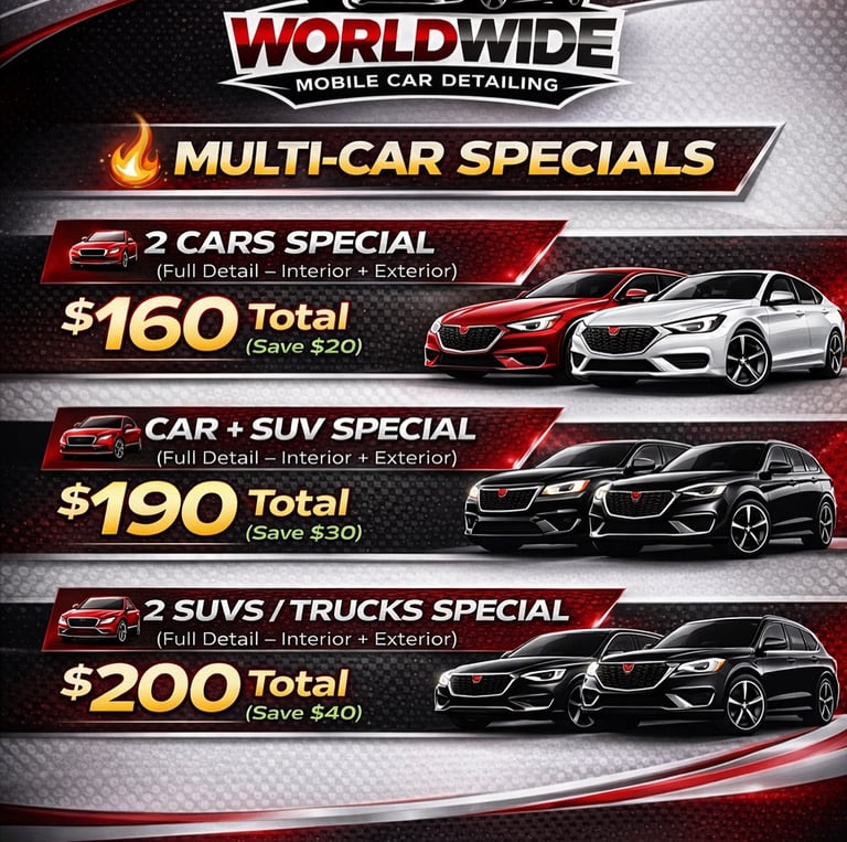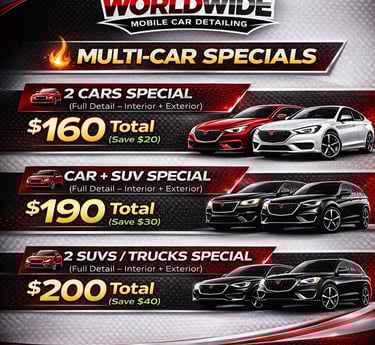 Experience top-tier vehicle detailing with Worldwide Mobile Car Detailing. Our expert team comes directly to your location, providing interior and exterior cleaning, waxing, and polishing for a showroom-quality finish. Enjoy convenience, premium products, and sparkling results, all without leaving your home or office. Perfect for busy lifestyles and those who value their car's appearance.