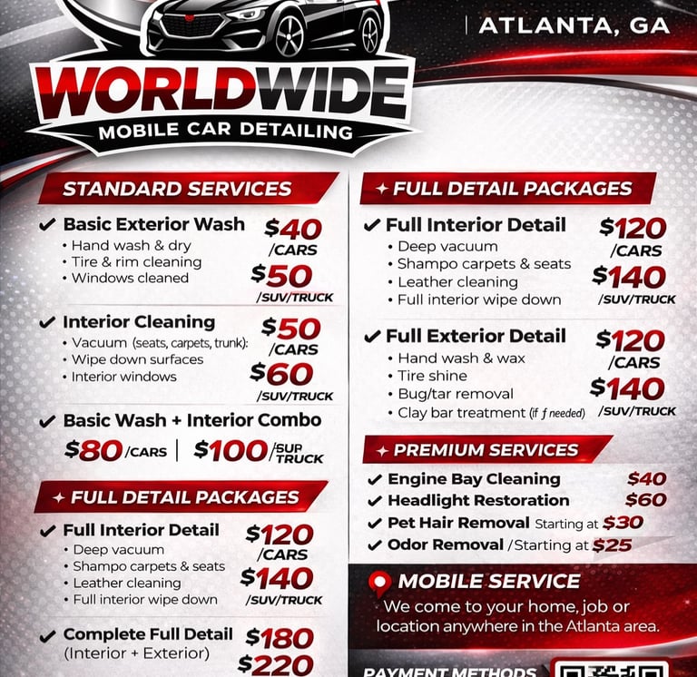 Atlanta 's premium mobile car detailing serive. We come to you, home, office, or anywhere in the metro. Luxury results, zero hassle. BOOK ONLINE TODAY